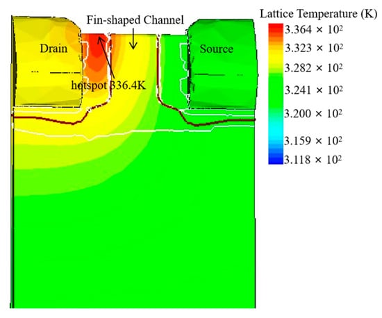 The temperature distribution of NFinFET with SR = 5 × 10−5 cm2 KW−1.