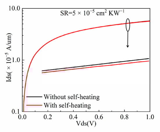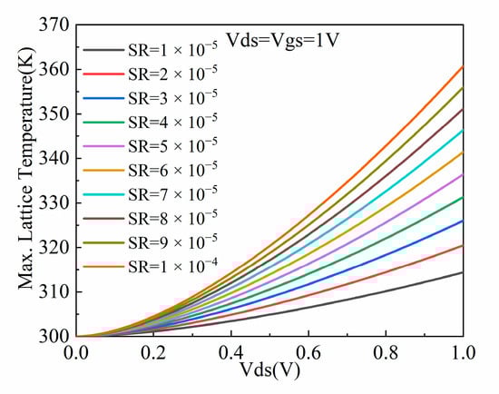 In addition, SR plays an important role in thermal characteristics. It can be inferred from Figure 7 that under the same operating voltage, as SR increases from 1 × 10−5 cm2 KW−1 to 1 × 10−4 cm2 KW−1, the drain saturation current decreases. This is because the increasing SR leads to a reduction in electron mobility from 790.254 cm2 V−1s−1 to 705.194 cm2 V−1s−1. Moreover, the increasing SR raises the maximum lattice temperature from 314.37 K to 360.76 K, as illustrated in Figure 8. This is because the increasing SR offers a low-speed thermal conduction path for heat flow from the source and drain contacts []. The higher lattice temperature further increases the probability of the phonons scattering and decreases the carrier mobility, which finally reduces the saturation current.