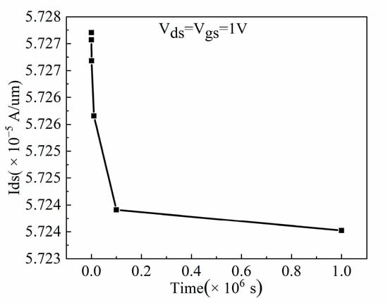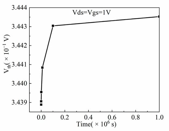 Figure 9 shows the variation of the threshold voltage against time under HCI. It can be concluded from Figure 9 that with an increase in operating time, the threshold voltage increases, which is consistent with the threshold voltage variation trend shown in []. This is because the carriers in the channel are continuously accelerated under the high electric field at the drain, the carriers acquire higher kinetic energy and thus become hot carriers. The hot carriers with high enough energy can cross the barrier of the Si/SiO2 interface and be injected into the gate oxide layer, then break the covalent bond, which finally generates the trapped charges. Due to the fact that the trapped charges cancel out part of the gate voltage, the threshold voltage increases.