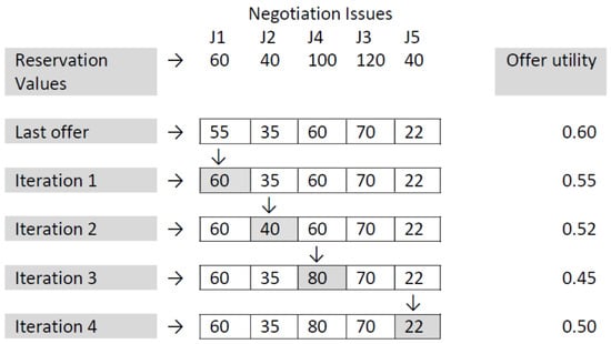 When the current least important issue (CLII) calculated value of the agent surpasses their CLII reservation, then the agent must update a second lowest-level issue, which becomes a CLII. This approach repeated until the agent finds a composite offer with the usefulness of its current iso curve or every issue reaches the value of its reservation.