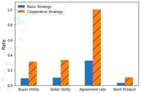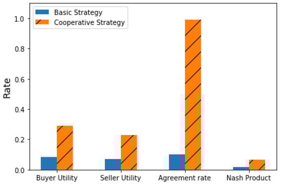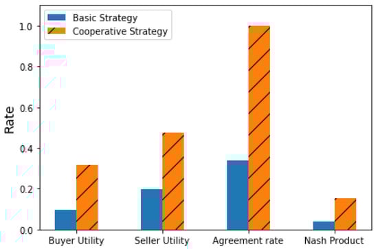 Figure 8 shows the results of negotiation when the environment is characterized by medium overlap and random deadlines. The utility rates results for the buyer agent and the seller agent are shown in Figure 8a,b respectively. The Figures show that both the buyer agent and the seller agent gain better utility rates when the buyer agent uses the hybrid strategy. The second best for both agents is the fuzzy-based strategy. The utility rate results are consistent with the utility rates shown in Figure 7.