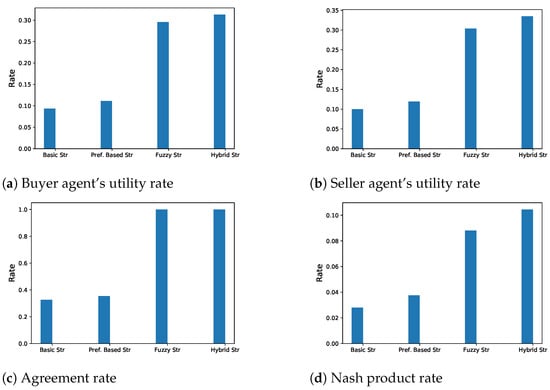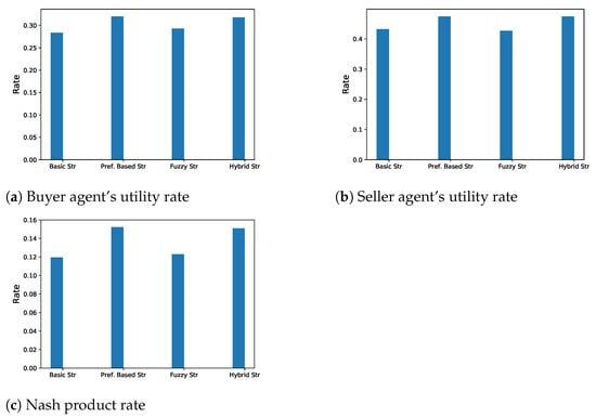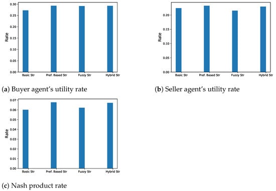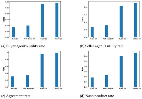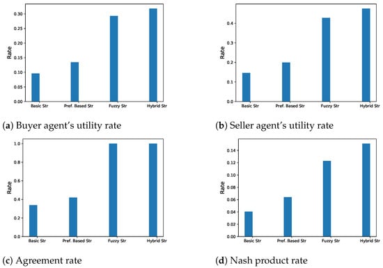 This part of the experimental results compares four negotiation strategies in terms of utility rate, agreement rate, and Nash product rate.