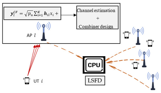 There are typically two implementation approaches for cell-free systems [24,25,26,27]: completely centralized and distributed. In the centralized approach, all signal processing is performed at the CPU. All APs forward the received pilot and data signals to the CPU, which will carry out the necessary processing. Taking into account the practical constraints of having links with limited fronthaul capacity, this approach typically leads to unmanageable fronthaul signaling.