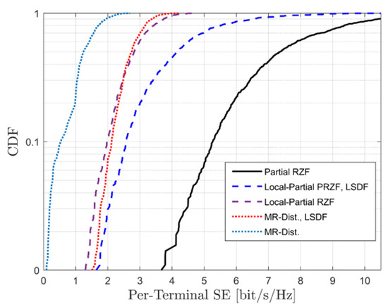 Figure 4 shows the CDF distribution as a function of the achieved average SE. Under the fronthaul constraints, the simulations are carried out for the different system implementations with total active UTs , serving single antenna APs , pilot length . It can be seen that there exists a significant gap in the performance between the ZF-based and MR-based combining schemes. This is because the MR schemes are unable to suppress the inter-user interference. For instance, the Local-Partial RZF scheme gives a 43% higher improvement in the average SE. Moreover, it can be observed that the system performance with Local-Partial RZF and MR can be enhanced by adding the LSFD scheme as a second detection stage.