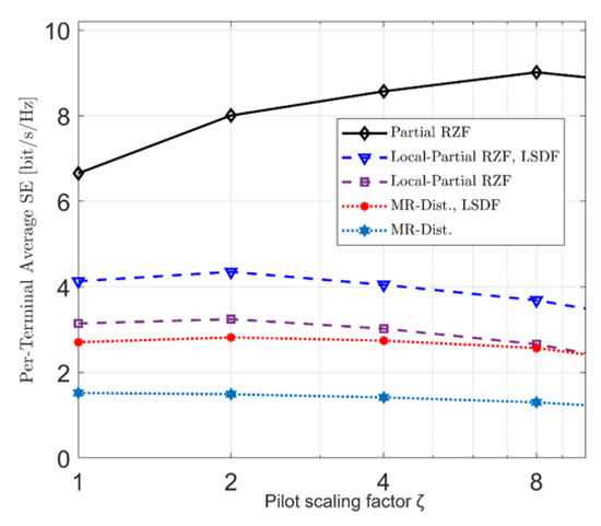 It can be observed that increasing the pilot scalers will improve the system performance due to the reduction in the pilot reuse, which in turn reduces pilot contamination. Thus, the average SE continues to increase up to a specific point. Furthermore, different schemes are saturated at different points. After these saturated points, any increase in the scaling factor will result in a decrease in the system average achievable SE. It is clear from Figure 5 that ‘8′ and ‘2′ are the saturation points for Partial RZF and MR distributed combining, respectively, while ‘2′ is the same saturation point for Local-Partial RZF and MR-Dist. This is the case when the LSFD scheme is employed. However, the two schemes without LSFD are saturated at ‘2′ and ‘1′, respectively.
