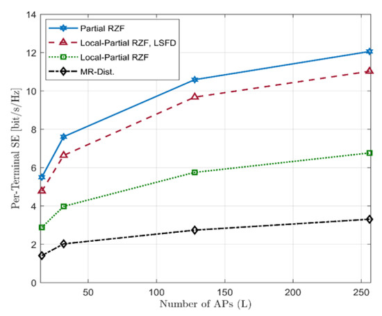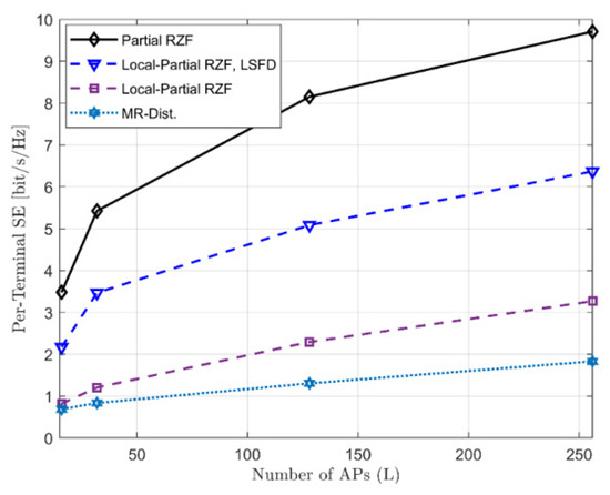 As can be seen in Figure 6 and Figure 7, a significant improvement in the achievable SE can be obtained for all schemes when grows higher. This is due to the increase in diversity gain, which increased with L. Furthermore, one can observe that Partial RZF, Local-Partial RZF, and Local-Partial RZF with LSFD benefit more as compared to the MR when grows higher. This is because of the ability of ZF-based schemes to minimize inter-user interference.