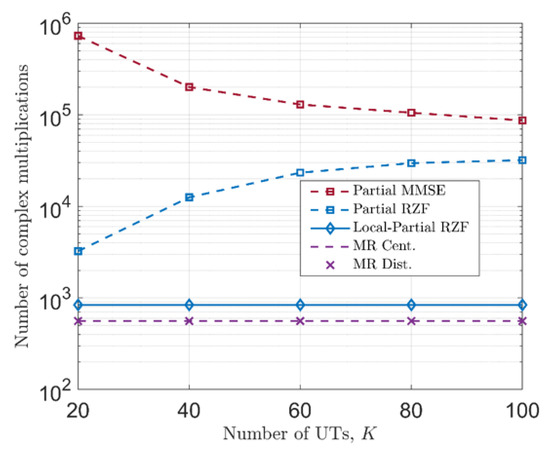 Figure 8 shows the complexity in terms of the number of complex multiplications as a function of UTs. Among all the five schemes, two centralized schemes, namely, Partial MMSE and Partial RZF, have the highest computational complexity. In the case of Partial MMSE using the dynamic cooperative clustering for a centralized scheme, the computational complexity decreases as the number of UTs increases [33]. In addition, the partial MMSE is a scalable combining scheme that can be employed with a slight loss in SE; as a benefit of this, a reduction in complexity is observed in Figure 8. The Partial RZF has achieved less complexity than Partial MMSE. However, as the number of UTs increases, the computational complexity increases, and the gap between the two schemes decreases. The reason is that in the partial RZF, on average, the number of UTs served by the same group of APS increases as increases.