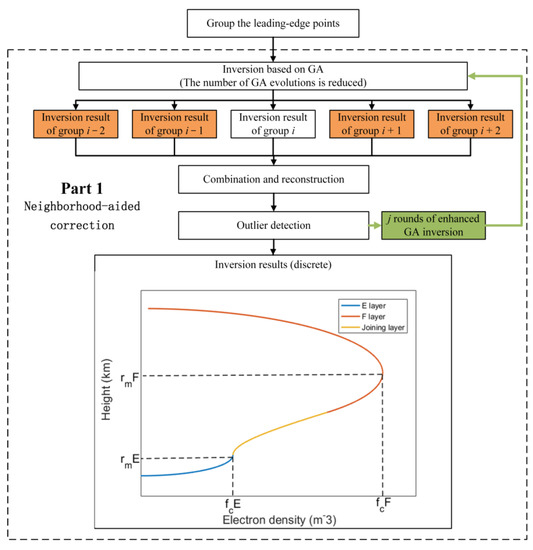 The potential numerical continuity of each set of inversion results can be used to assist the GA in correcting the inversion results. Conventional genetic inversion methods regard the inversion process of each frequency band as an independent event and do not consider the continuity of the overall electron density change. In fact, when the frequency steps are small, the ground range changes little, as does the corresponding ionosphere reflection region. According to experience, for radar or communication equipment, the variation trend of the three parameters is relatively stable, and there will not be many drastic changes in a small range. Therefore, the information used by the conventional inversion method based on the GA is incomplete, and its anti-error ability needs to be improved. In this regard, we propose a neighborhood-aided correction method, and the specific steps are as follows:
