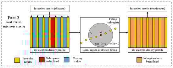 The common method for addressing an incomplete ionogram is approximate substitution; that is, the missing value is replaced by the adjacent value of the missing parameter, and only the existing information is used for subsequent calculation. This method does not consider the gradient change of the real electron density distribution, which will introduce conflicting information or artificial error and reduce the inversion accuracy. To solve this problem, we design a multistep fitting method based on the moving least-square method. The two-dimensional electron density region to be fitted is divided into several local subregions to be fitted, and the weighted least-square method is applied to fit all nodes in each local subregion. Weighted and segmented processing is carried out in each subregion until global fitting is completed. According to this idea, in the region of fit, the gradient of electron density does not obviously change, so a smooth two-dimensional profile can be fitted. In the whole large region, several independent fitting regions can reflect the horizontal gradient of the electron density distribution. The multistep fitting method can improve the reconstruction accuracy of the two-dimensional profile and better match the real situation. The specific steps are described below.