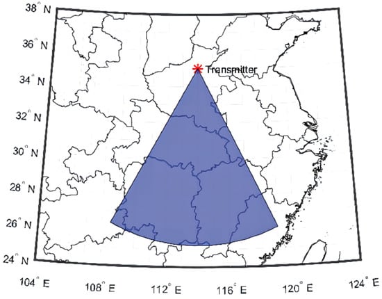 The experimental parameters are set as follows: The detection point is at (35.0° N, 114.0° E). The direction of propagation is southward, and the local time at the transmitter is 13:00 on 20 August 2015. The detection method is sweep frequency detection, the sweep frequency range is 3.2 to 28 MHz and the detection elevation is 15° to 65°. The transmitter location is shown in Figure 3.