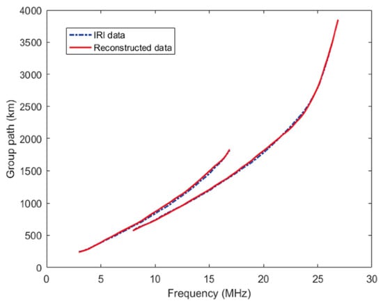 When the ionospheric detection direction has a north–south component, the geographical latitude of the radio wave reflection region will change with the propagation distance, and this latitude change has a great influence on the ionospheric critical frequency . Therefore, unlike the ideal condition that only three sampling points can be taken on the leading edge to invert the complete ionosphere, for detection across latitudes, the whole leading edge should be sampled at small intervals many times. Specifically, to obtain the ionospheric reflection region information corresponding to different ground ranges, it is necessary to group the leading edges according to the change in the detection frequency (from small to large). When the frequency interval is small enough, the reflection region corresponding to a set of data (a small leading edge) is also small enough to be approximately considered to be in the same state. The reflection regions corresponding to different sets of data are in different states. This not only conforms to the MQP model selected but also reflects the ionospheric changes in the whole detection direction through the inversion results of different groups, that is, local uniformity and overall nonuniformity.