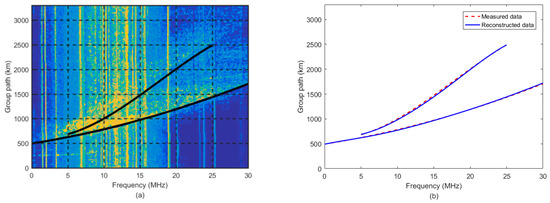 An example using measured data is shown in Figure 6, which occurs at 10:14 LT on 19 February 2016. Similar to the previous simulation results, the proposed method reliably reconstructs the leading-edge data, thus proving its potential to process real data.