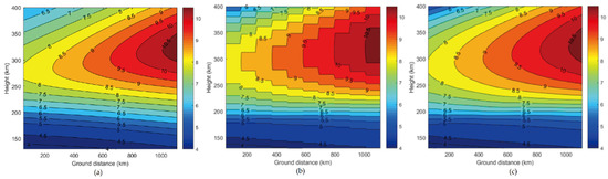 The comparison between Figure 9b,c shows that neighborhood-aided correction increases the inversion accuracy of ionospheric parameters, making the electron density distribution more consistent with the real value, and its ray tracing results are also preliminarily corrected. For example, the rays originally emitted at an elevation of 40° in Figure 9b are not reflected correctly and are corrected in Figure 9c. Within the range of elevation angles (15–35° in the figure) from which the radio wave can be reflected to the ground, the average distance error from the ground range in Figure 9a decreases from 113.4 to 84.3 km and the average error percentage decreases from 8.9 to 6.9%.