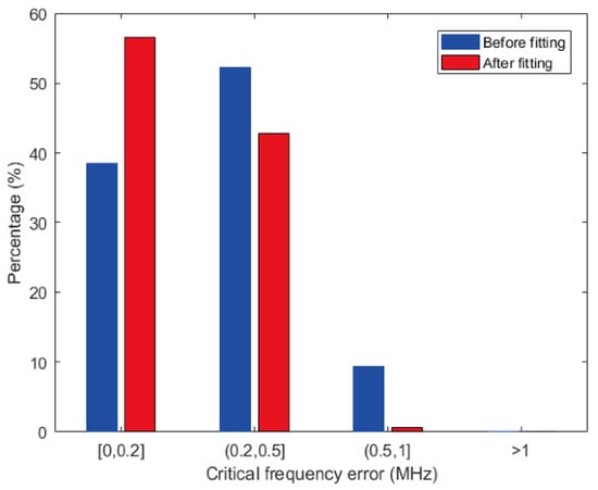 Without loss of generality, 100 experiments are conducted at other transmitting points within 150 km of the original radio transmitting position (the other conditions remain unchanged). The results before and after fitting are compared with the real two-dimensional section, and the error statistical results are obtained, as shown in Figure 8. When the critical frequency error exceeds 0.5 MHz, the inversion results are judged to be incorrect. When the critical frequency error is between 0.5 and 0.2 MHz, the inversion results are basically accurate. When the critical frequency error is less than 0.2 MHz, the inversion results are very accurate. As shown in Figure 8, 99.3% of the inversion results are controlled within the error range after the fitting method in this paper is applied, which is 8.7% higher than before fitting. In addition, 56.5% of the inversion results are very accurate, 18.1% higher than before fitting. The method presented in this paper improves the inversion ability of the two-dimensional electron density profile and has application value in processing complex and changeable backscatter data.
