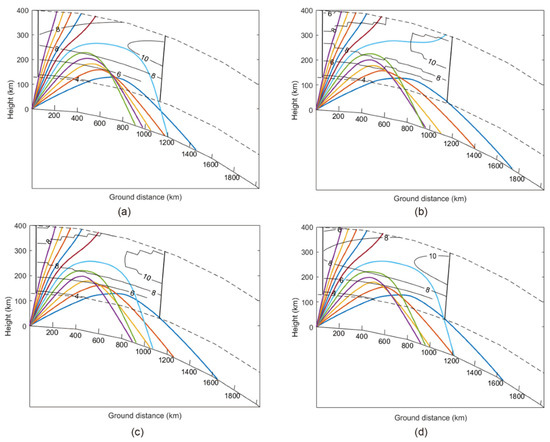 Figure 9 shows the ray tracing results when the wave frequency is 13 MHz and the elevation angle ranges across 15° to 65° (5° apart). Figure 9a is the ray tracing result using the real ionospheric profile, Figure 9b is the ray tracing result inversion using the conventional GA (without neighborhood-assisted correction and local step fitting) and Figure 9c is the ray tracing result after neighborhood-aided correction only. Figure 9d is the ray tracing result improved by using both neighborhood-aided correction and local region multistep fitting, which is the final inversion result of this paper. Table 3 shows the ground distance of the ray tracing results.