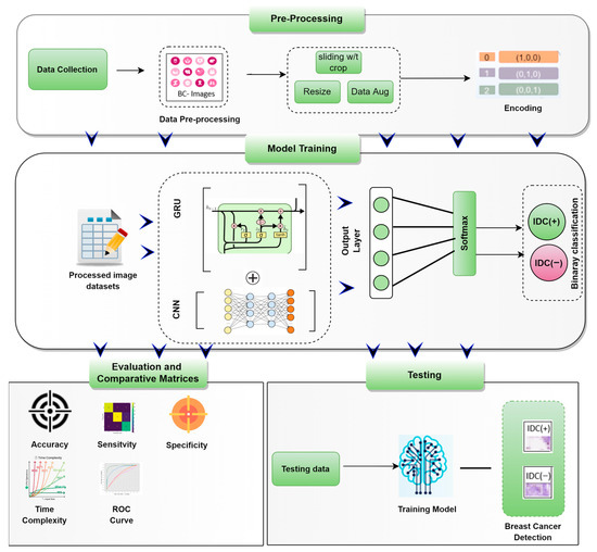 Two key phases are required to perform the breast cancer (IDC tissues) detection process: data collecting and pre-processing (labeling and resizing), as shown in Figure 1. While the other is to analyze the data using the proposed CNN-GRU model for further detection.