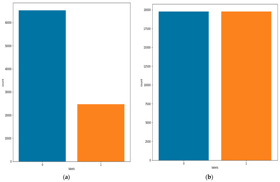 In this study, a publicly accessible dataset was obtained from the well-known Kaggle website (http://Kaggle.com (accessed on 10 March 2020) [56]. While the full dataset comes from the research [57], including 162 women diagnosed with IDC at the Hospital of the University of Pennsylvania. The dataset contains high-resolution pathologist images (2040 × 1536 pixels). To maintain consistency, each slide was scanned at a resolution of 0.25 micro/pr and 277,524 small images were extracted from the original dataset. There was a total of 277,524 images obtained, 78,786 of which were IDC (+) samples presented as 0 labels, and 198,738 non-IDC (−) were labeled 1, as given in Figure 2.