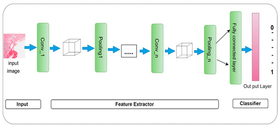 CNNs are used to find images pattern and have several front layers of CNNs, the network can detect lines and corners. We can, however, transfer these patterns down through our neural network and try to identify more distinctive features as we progress deeper into the network [48]. The CNN model is extremely efficient for image feature extraction. Additionally, according to the researchers, the proposed CNNs model efficiently identifies BC from breast tissue images. The structure of the CNN is consisting of three main layers: the pooling, convolutional layer (CLs), and, fully connected layers (FCs). The CLs are responsible for calculating the outcome of neurons connected to local points. It is determined by considering the dot product of the weights and region. In the case of the input images, the typical filters consist of a small area (3 × 3 to 8 × 8) pixels. Such filters can scan the images by sliding a window over the image and automatically controlling the recurrent patterns that appear in any image region during the scanning process. The stride is the distance between filters in a chain. They extend the convolution to include windows that overlap if the stride set of parameters is less than any of the filter dimensions. Figure 5 presents the main architecture of the CNNs.