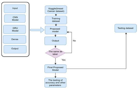Figure 8 shows the flowchart from the pre-processing step to classification of the proposed model; Initially, the Kaggle dataset was split into testing and training sample data, then the proposed CNN-GRU is trained by input image data with various training parameters and filtered the important features; after feature extraction, the proposed model is tested using different key performance measure of BC-IDC (+,−) classification.