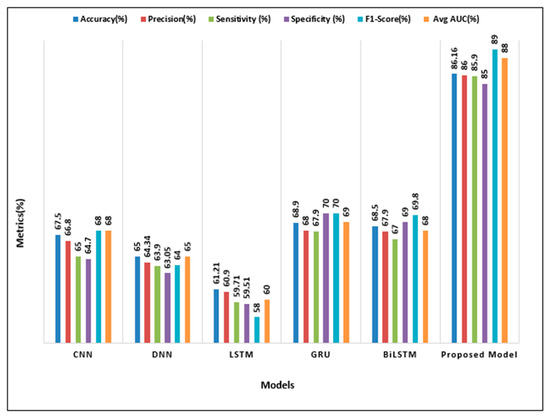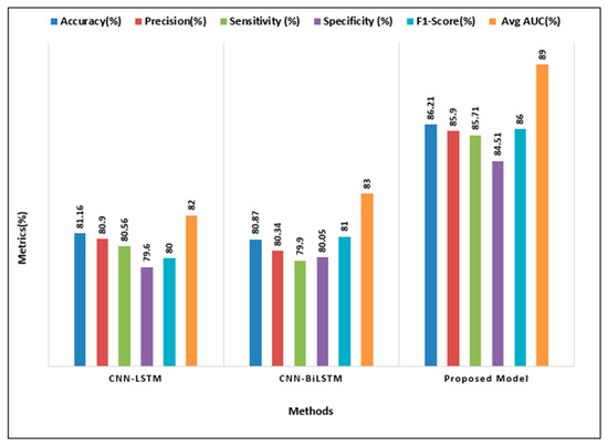 The proposed method attained an Acc of 86%, Prec of 85%, Sens of 85%, an F1 score of 86%, and AUC of 0.89, respectively. Figure 9 contains the all-performance measurement indicator analysis that was performed during predicting.