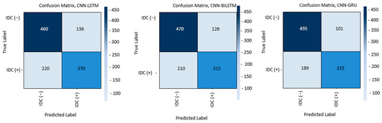 The confusion metric of the CNN-GRU with CNN-LSTM and CNN-BiLSTM for binary BC-IDC (+,−) image classification.