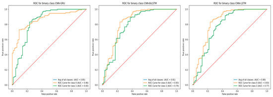 The ROC curve analysis of the CNN-GRU along with CNN-LSTM, and CNN-BiLSTM of BC-IDC (+,−) detection.