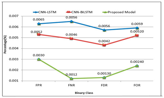 The proposed IDC breast cancer detection approach can be further investigated by extensive key performance metrics composed of false omission rate (FOR), FPR, FNR, and false detection rate (FDR). The CNN-GRU model performed better than CNN-LSTM, and CNN-BiLSTM with 0.0030 FPR, 0.0024 FOR, 0.0012 FNR, and 0.0013 FDR as shown in Figure 12.