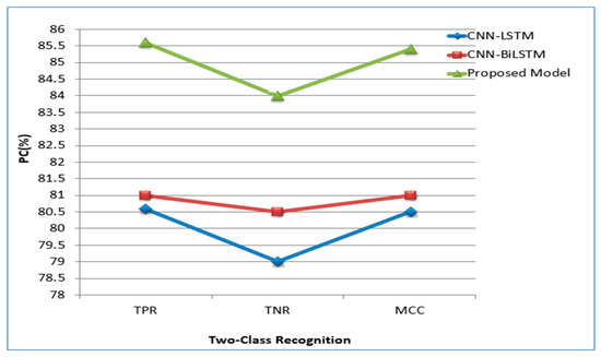 To evaluate the performance, of the proposed hybrid model through analysis, a confusion matrix technique is implemented to identify the TNR, TPR, and MCC values. Figure 13 presents the TPR, TNR and MCC, which are 86%, 84%, and 85.5%. The proposed CNN-GRU model has the best outcomes as compared to other hybrid models.