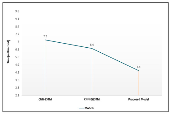 The time complexity (ms) is measuring the training time of the model during the process of classification. The fact that most of the training was completed offline was not considered during the experiment. As shown in Figure 14, the proposed CNN-GRU has a training time of 4.4 milliseconds, which is much less than the training times of CNN-BiLSTM and CNN-LSTM, which are 6.4 and 7.4 ms, respectively.