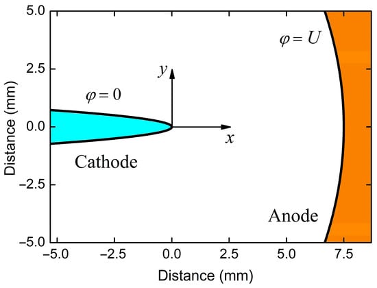 Consider a gas diode with a blade cathode: see Figure 1. The origin of coordinates coincides with the cathode apex; the x-axis lies in the plane of symmetry of the system, and the y-axis is perpendicular to it. We use the parabolic approximation for the cathode shape, x = −y2/(2R), where R is the edge curvature radius. Since RAEs are generated at the initial stage of breakdown development, we can assume that the gas in the gap is not yet ionized, and the electric field distribution is not distorted by the volume electric charge. Then, the potential of the electric field satisfies the Laplace equation with the condition of equipotentiality of the cathode surface (without loss of generality, this potential can be taken equal to zero). The corresponding solution is
