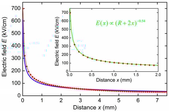 Formulas (1)–(4) adequately approximate the actual field distribution along the gap. So, Figure 3 (red diamonds) shows the distribution of the electric field strength (in absolute value) between the edge of the tubular cathode and the anode (U = 50 kV, R = 50 μm, D = 7.5 mm, the tubular cathode diameter is 6 mm) calculated by the SAM code []. This distribution is sharply inhomogeneous. The field strength is ~700 kV/cm at the cathode edge, which is several times higher than the runaway threshold Ec, and it drops to ~30 kV/cm near the anode, which is an order of magnitude lower than Ec. For comparison, we also present the electric field distribution corresponding to formula (3): blue solid line in Figure 3. As can be seen, the analytical approximation demonstrates a fairly high accuracy. The inset in Figure 3 shows the calculated field distribution in the immediate vicinity of the cathode edge (i.e., in the region where the field distribution should be close to two-dimensional), as well as its approximation by the power law