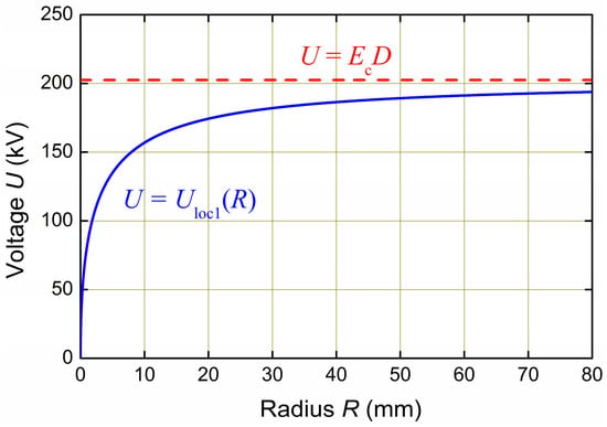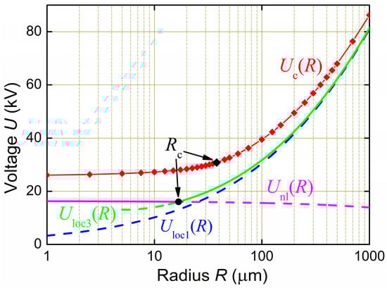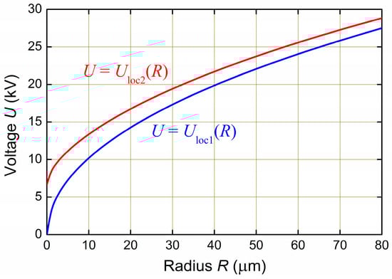 It can be seen from Figure 6 that the value of Uc monotonically increases with increasing radius R. At , this value is minimum and amounts to ~25.8 kV. In our works [,], it was indicated that Uc must exceed a certain minimum value determined by the equation