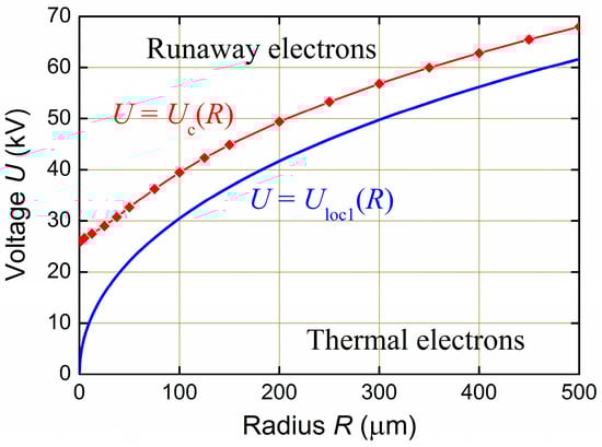The equation of motion was solved on the segment . The cathode curvature radius R and the voltage U applied to the gap were varied over a wide range. We analyzed the conditions under which an electron starting from the cathode will run away, i.e., continuously accelerate throughout the entire interelectrode gap. This regime of motion is realized when condition (7) is satisfied, i.e., when the total force acting on the electron is positive along the whole trajectory. The simulation results are shown in Figure 6, where the boundary of the regions where free electrons run away and where they become thermal is plotted (red diamonds) on the parametric plane {R,U}. This boundary was determined as a result of varying U at fixed R; we searched for the minimum voltage values (Uc), at which condition (7) was satisfied.