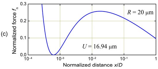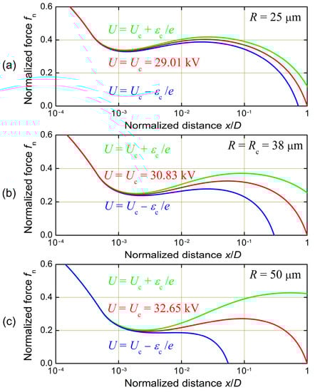 The numerically calculated characteristic x-dependences (on a log scale) of the normalized force fn for near-threshold voltages Uc–εc/e, Uc, Uc + εc/e for R = 25 μm (a), R = 38 μm (b), R = 50 μm (c). The corresponding threshold voltages are ~29.01, 30.83, 32.65 kV.