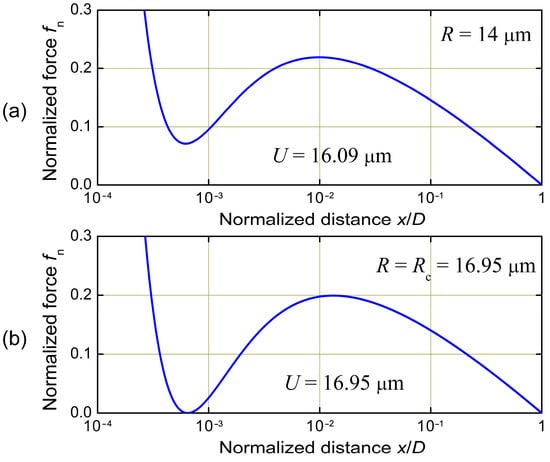 which for RAEs is always in the range 0 < fn < 1. In Figure 7a–c, the red lines show characteristic dependences fn(x) for R = 25, 38, 50 μm at threshold voltages U = Uc (~29.01, 30.83, 32.65 kV, respectively). The runaway threshold, as can be seen, corresponds to the situation where fn is positive everywhere except for the single point x = D, where fn = 0. From this, we can conclude that it is important to analyze the behavior of an electron near the anode. Moreover, one might get the impression that the behavior of an electron near the anode will determine the runaway threshold for any R. However, this conclusion is not true. The fact is that the regime of electron motion corresponding to the threshold U = Uc is not always stable and the corresponding dependences fn(x) do not give a complete picture of the RAE dynamics.