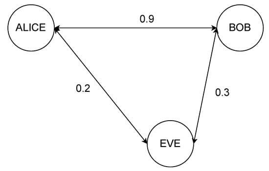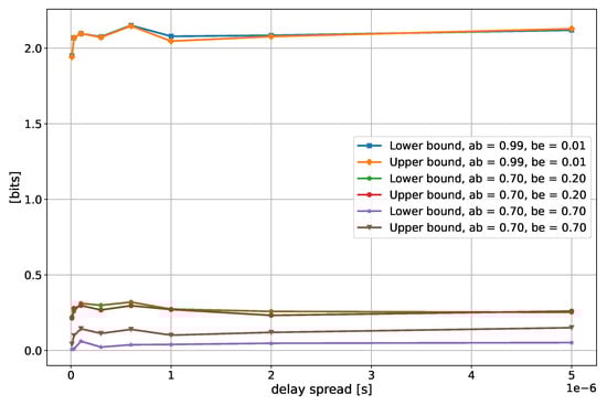 The main goal of the work is to assess the value of the SKR under different channel conditions in a system where the encryption keys are generated according to the previously explained PLKG protocol. Figure 1 outlines the presence of the users in the channel, with a particular emphasis on the mutual correlation, whereas a summary of the simulation parameters is reported in Table 1. The target observation is the frequency response of the channel, processed through the filterbank method []. Therefore, the vectors of channel observations , , consist of the output of the filters applied to the power spectral density (PSD). Moreover, the filters are supposed to be ideal pass band filters and the PSD is obtained through the square FFT of the channel impulse response (CIR), which is generated according to a wideband tapped delay model [], where it is possible to tune the delay spread (DS) and the Rice factor K. Furthermore, the PSD observed by Alice Bob, and Eve is generated according to some mutual correlation target. This is accomplished through the Cholesky decomposition, even though it is only theoretically supported in the case of Gaussian samples. The channels are generated in order to achieve a bandwidth of 160 MHz.