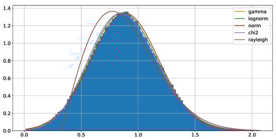 This method is known to be theoretically grounded for Gaussian variables and according to [], it is still reliable in case the variables are Gamma distributed. The Rice distribution is approximated by the Nakagami-m distribution and Gamma variables can be obtained as the square of Nakagami-m variables. By means of the Fitter (https://pypi.org/project/fitter/, accessed on 12 August 2022) class, the PSD samples were fitted in order to empirically determine the distribution of the samples. By looking at Figure 3 and Table 2, where the Sumsquare error and the parameters (following thescipy.stats (https://docs.scipy.org/doc/scipy/tutorial/stats.html, accessed on 12 August 2022) notation) is reported for different distributions, the PSD samples distribution seems to fairly comply with a gamma distribution. Therefore, it is reasonable to suppose that the PSD samples are gamma-distributed and the method of the Cholesky decomposition is still reliable in this case. For instance, by setting the target correlation between Alice and Bob to 0.99 and the correlation between Alice/Bob and Eve to 0.1, the actual correlation levels were then computed from on the channel samples achieved after the Cholesky decomposition, and turned out equal to 0.99 and 0.09.