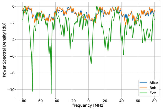 As an example, Figure 4 depicts an example of channel realization, showing that, for high Alice–Bob correlation, the channels in frequency are quite similar, and instead Eve observes an uncorrelated channel.