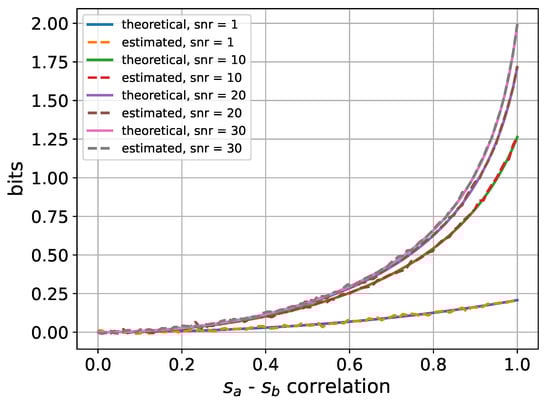 Figure 5 shows the results of the comparison. In particular, the mutual information significantly drops when the correlation is different from 1. Moreover, the estimated curves correspond to the theoretical case, confirming the correct behavior of the estimators. Since the SKR is a combination of mutual information, the same agreement between the theory and the simulation is expected regarding the SKR. This also proves the correctness of the simulation procedure employed.