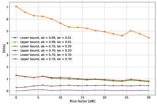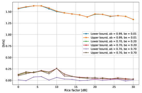 Let’s start from the Lower Bound, assuming that Alice and Bob share highly correlated channel samples and that the correlation between Alice and Eve channel samples is the same as that between the Bob and Eve samples. Moreover, all the links share the same channel condition in terms of SNR and Rice factor K. The lower bound of the SKR can be reduced to:
