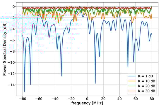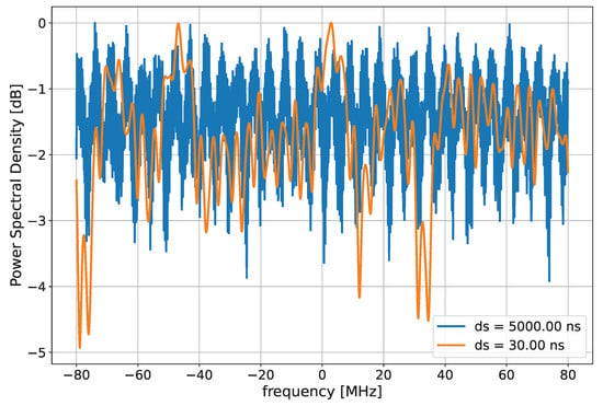 The reason for this behavior can be understood by looking at Figure 13 and bearing in mind that the number of paths in the TDL is fixed: when the DS is low, there is a higher probability that the different paths cannot be resolved singularly; therefore, they might severely interfere and create a deep null in the PSD. In contrast, when the DS is larger, the different paths are spread over a wider delay range, and therefore they less frequently add up coherently inside the PSD, thus corresponding to a more oscillating PSD, but without deep fades.