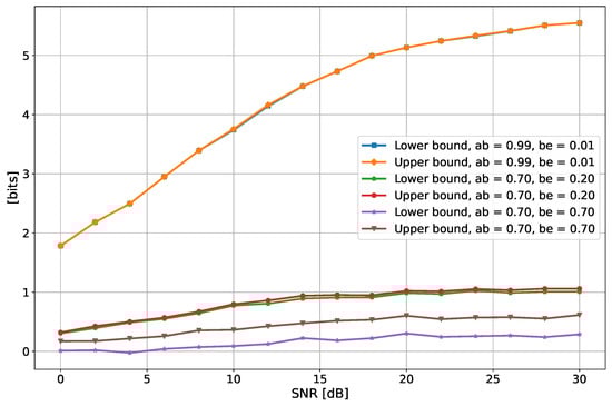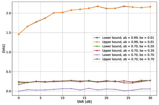Since the upper bound and the lower bound are equal, when Alice and Bob share highly correlated samples that the SKR reduces to ; therefore, it is expected that for a high correlation, similar values for the upper and lower bounds should be achieved.