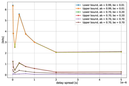 Secrecy key rate as a function of the delay spread of the channel of Alice and Bob, for different values of the correlation and with 1 filter. In the legend, “ab” and “be” stand for Alice–Bob correlation and Bob–Eve correlation.