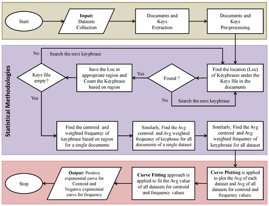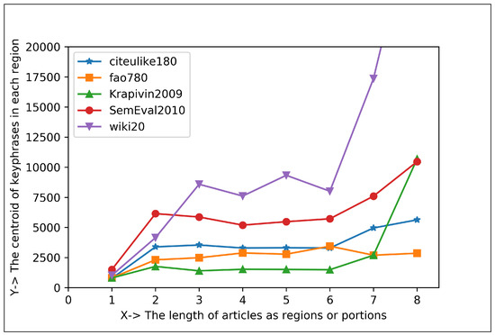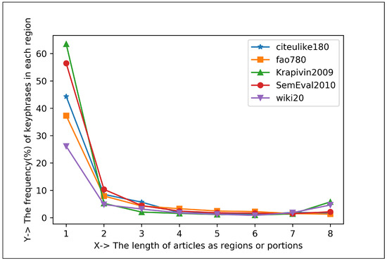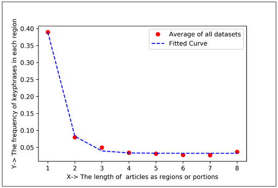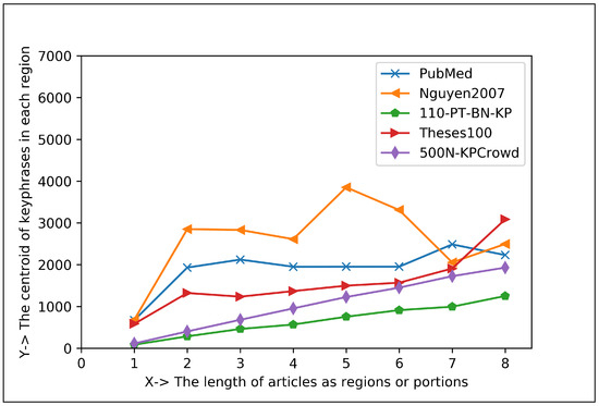 Datasets contain several issues such as punctuation, accent marks and other special characters, numbers, white spaces, abbreviations, uppercase letters, etc. For this reason, they need to be standardized. In our proposed technique, four pre-processing techniques have been utilized, which are: changing the text’s case to lowercase; using regular expressions to remove the extraneous numbers; eliminating all punctuation from the text; and removing empty spaces by using the strip() function [44,45,46]. The split() method is then applied to the key files to calculate the number of keyphrases based on the newline (∖n) (also shown in Figure 2). The proposed technique then considers the length of the document is broken into eight (8) regions and employs the first appearance keyphrase to analyze the centroid and frequency of keyphrases.