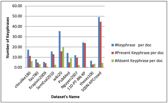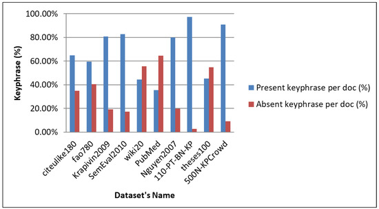 The proposed method is tested using ten (10) standard datasets (see in detail in Section 4.1). The proposed technique then counts the number of documents (doc), the number of keyphrases, the number of present keyphrases, and the number of absent keyphrases as well as calculates the processing time (sec) per dataset shown in Table 1. The average number of present and absent keyphrases in each doc is analyzed for every dataset and is demonstrated in Figure 3. Similarly, the average present keyphrases as well as absent keyphrases per document (%) for each dataset are illustrated in Figure 4. The proposed technique’s results demonstrate that, on average, 68.11% of keyphrases are present per document across all datasets, while 31.89% of keyphrases are either missing or absent.