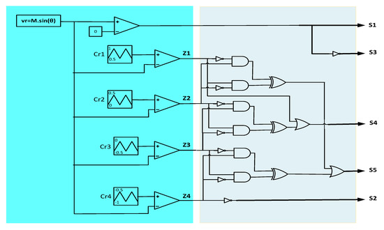 where vr presents the reference volage, Z1, Z2, Z3 and Z4 are the comparison results between the reference and carried triangular 1, 2, 3 and 4, respectively; Cr1, Cr2, Cr3 and Cr4 present the carried triangular 1, 2, 3 and 4, respectively.