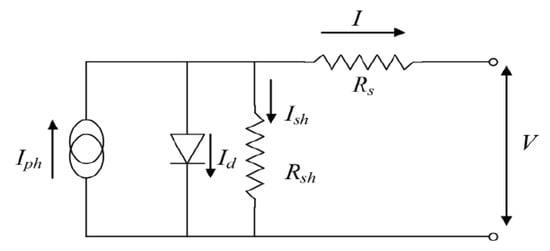 A standard PV cell is schematically represented by a source of current linked in parallel with an ideal diode, and two resistors in serial connection, as shown in Figure 3.