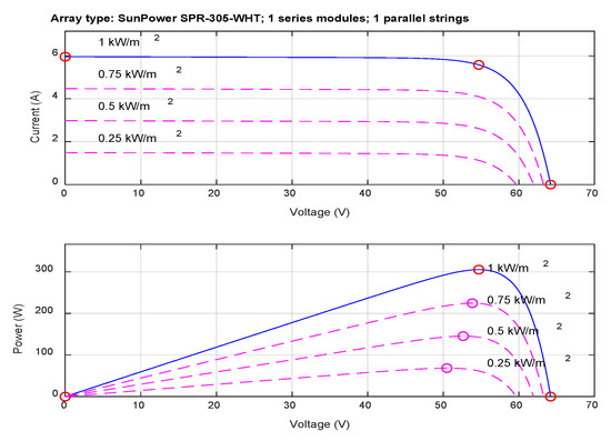 Table 2 shows the SunPower SPR-305-WHT panel characteristics. SunPower technology has been preferred because, over its outstanding 35 years of solar expertise, it has been awarded more than 900 patents. Figure 4 shows the P-V and I-V characteristics of the considered PV array and the corresponding MPP values for four various irradiances.