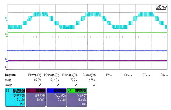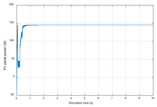 Figure 5 shows the progress of the output power of the PV array during the simulation. One can observe that within a short time (less than 0.5 s), the MPP has been attained (around 145 W). The output voltage of the PV array is maintained around the maximum value of 53 V, which coincides with the characteristics of the PV array shown in Figure 4. The evolution of the output voltage of the PV array is shown in Figure 6. It has then been boosted, which produces the DC-link voltage. The evolution of the latter is presented in Figure 7. The DC link voltage is actually the reference for the voltages of the two capacitors, which are properly adjusted and continued around half of the DC-link voltage (75 V).