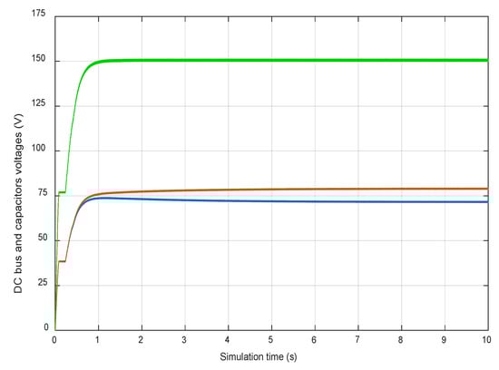 DC-link voltage evolution (the green curve) and capacitors voltages evolution (the red and blue curves).